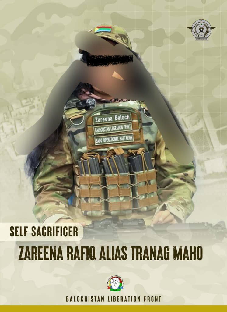 در تازه ترین اقدام دیدیم که گروه مرتد و سکولار بلوچBLA زنی بلوچ به نام رزینه رفیق را در یک کار انتحاری بر نیروهای حکومت سکولار پاکستان منفجر کرد.